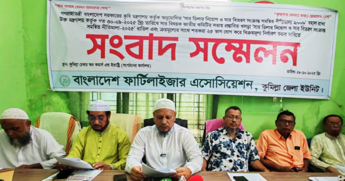 কুমিল্লা, ২৮ অক্টোবর: বাংলাদেশ ফার্টিলাইজার এসোসিয়েশন (বিএফএ) কুমিল্লা জেলা ইউনিট শক্তভাবে দাবি জানিয়েছে যে, সার সরবরাহে স্থিতিশীলতা বজায় রাখতে এবং